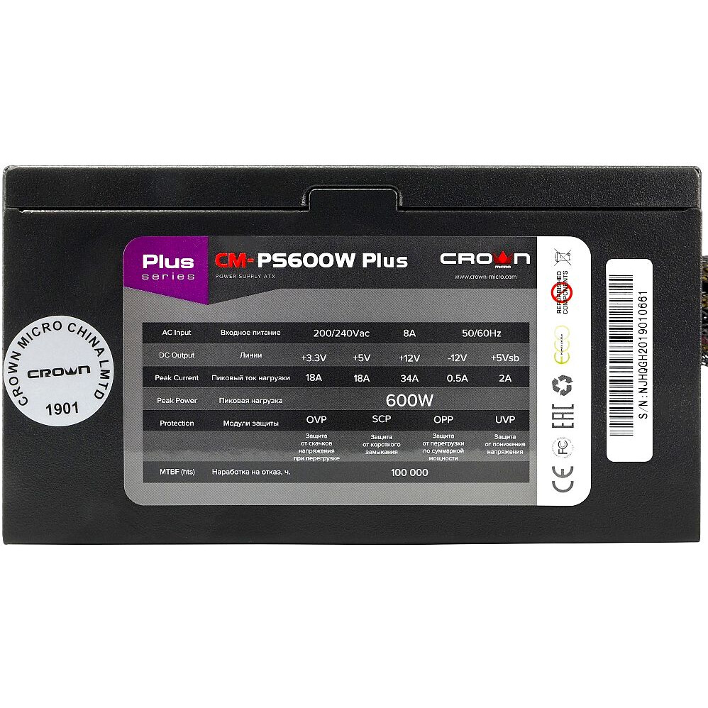 Блок питания Crown 600W CM-PS600W PLUS . 600W | 140mm FAN, SATA*4, PATA*4, 4+4pin, 6+2pin PCI-E*2 . 93 .55 р . В . . .