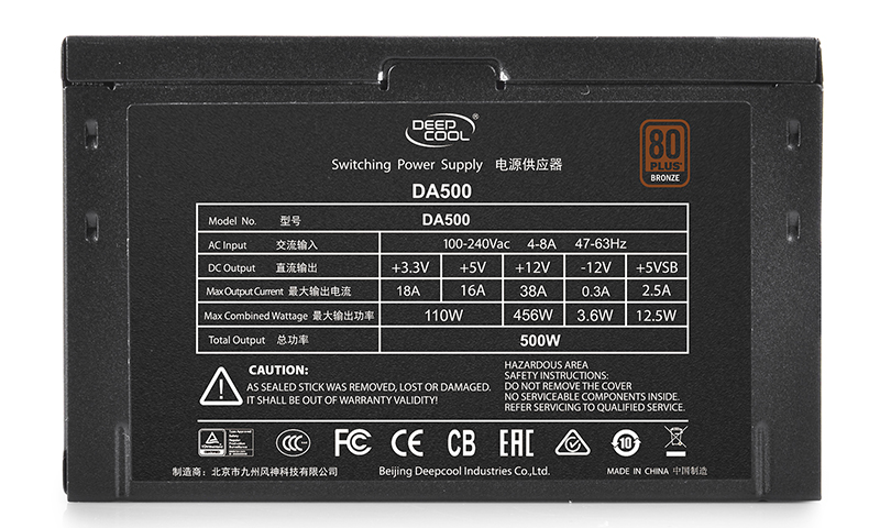 Deepcool DN500 . Блок питания Deepcool DN500 относится к серии Nova, обладает выходной мощностью 500 Вт и отличается от рассмотренных ранее устройств этой марки соответствием сертификату 80 Plus 230V EU и обещает в среднем 85% КПД .