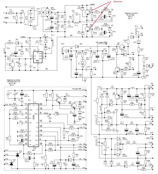 Ремонт блока питания FSP ATX 350PNF . Здравствуйте . Помогите пожалуйста с ремонтом блока питания . Схему блока питания прилагаю . Блок питания работает, запускается, все напряжения в норме, но вот . . .