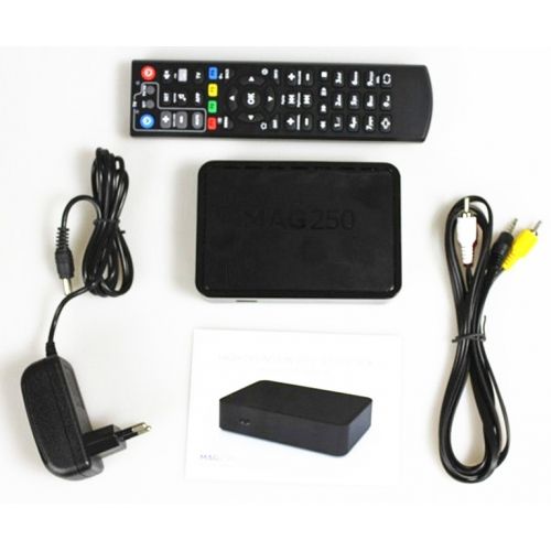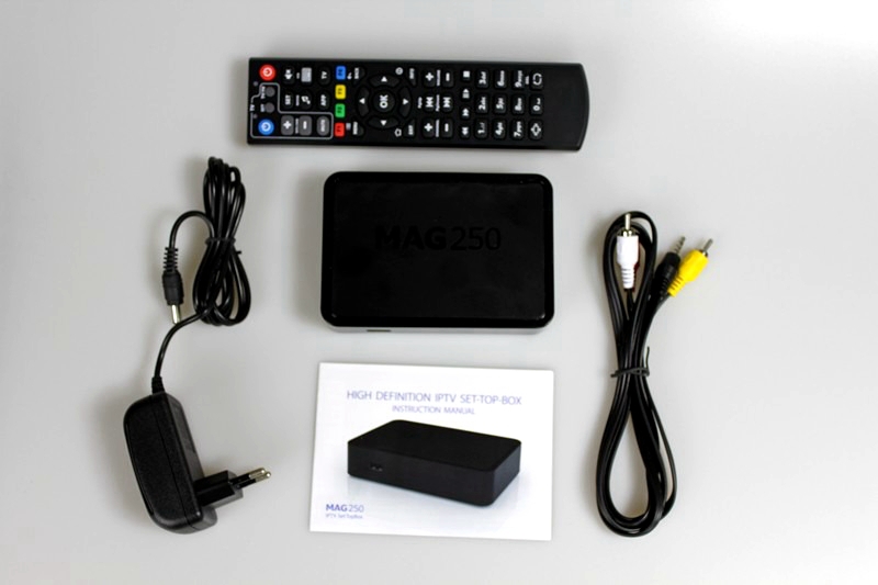 Кроме mag-250 , в комплект входит: аудио- и видеокабель rca; пульт дистанционного управления; две батареи ААА; внешний блок питания .