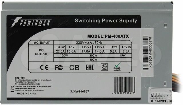 Powerman PM-400ATX — Блок питания 400 Вт ATX 12V без PFC 24+8 pin, 24+4 pin, 20+4 pin Коннекторы питания видеокарты: 1x 6-pin разъем