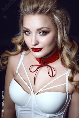 Picture of Tied to a wooden pole girl sitting in an old attic of an abandoned building . Beautiful young blonde girl in a black dress and stockings as a hostage with his hands tied stock photo, images and stock photography . Image 73106284 .