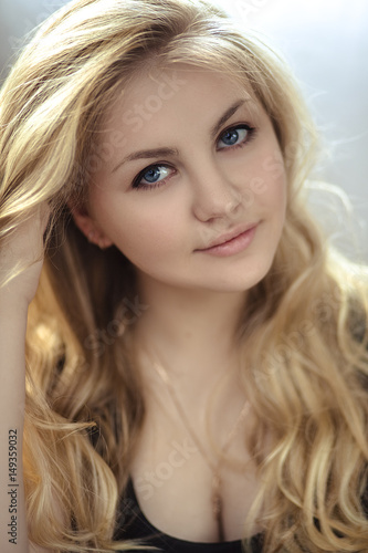 Beautiful blonde girl blue eyes in lace blouse made of natural eco fabric on beige background smiles, looks at camera, positive . Beautiful blonde blue eyes girl . Blonde with a perfect long hair . Beautiful blonde girl with blue eyes and a perfect long hair, isolated on white background .