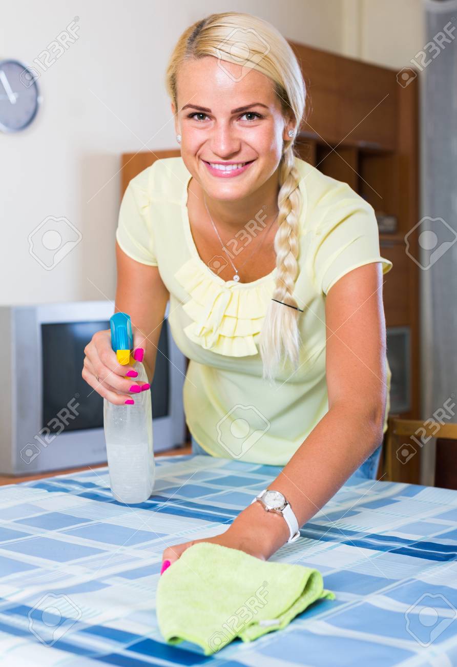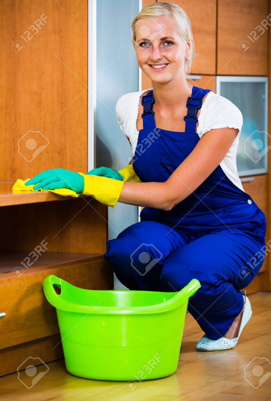 Blonde Maid Cleaning In Domestic Kitchen Stock Photo . . .