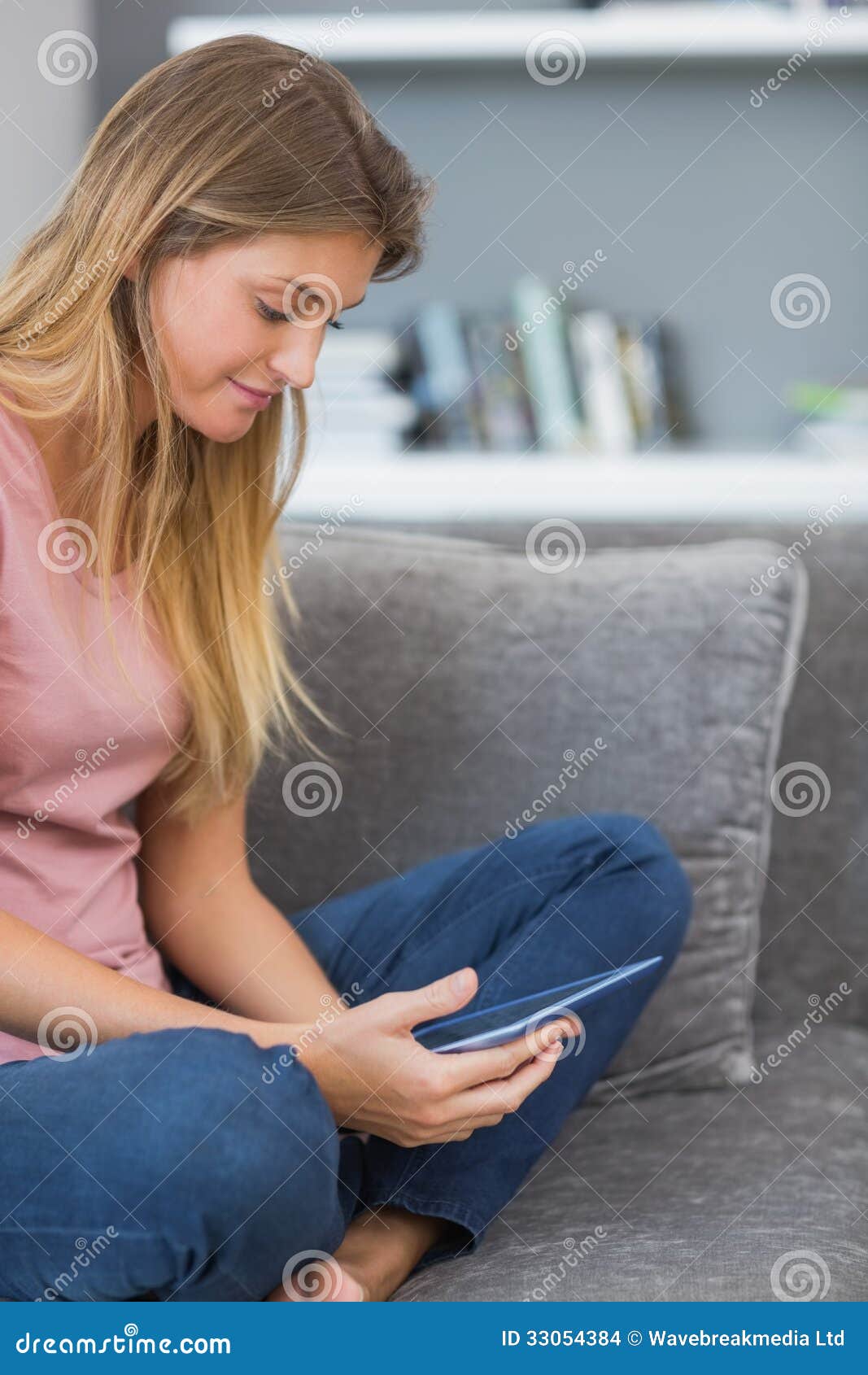 Блондинка сидит на диване