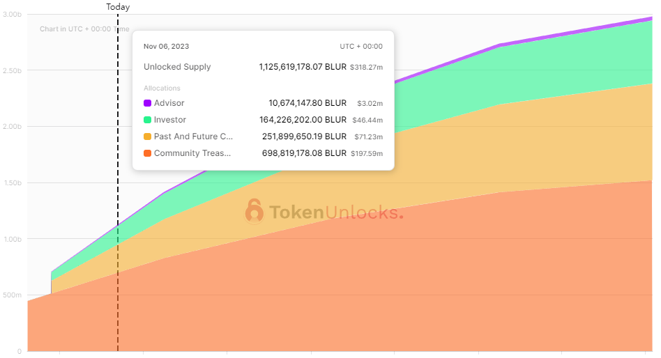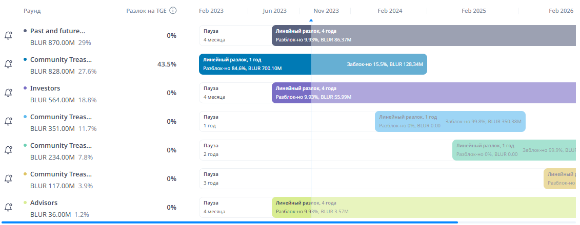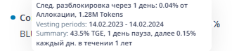 Основная часть монет досталась комьюнити, всего 1.53 миллиарда монет, из них в циркуляции находятся уже почти половина монет около 700 миллионов, что составляет около 65 процентов от общего циркулирующего объема, клиф 43.5% TGE, 1 день пауза, далее 0.15% каждый день до 14 Февраля 2024 года.