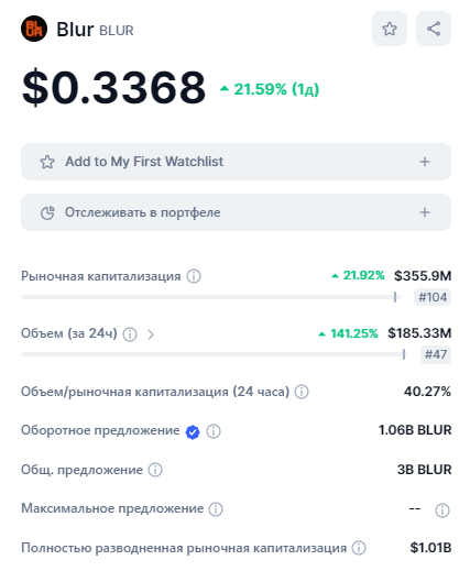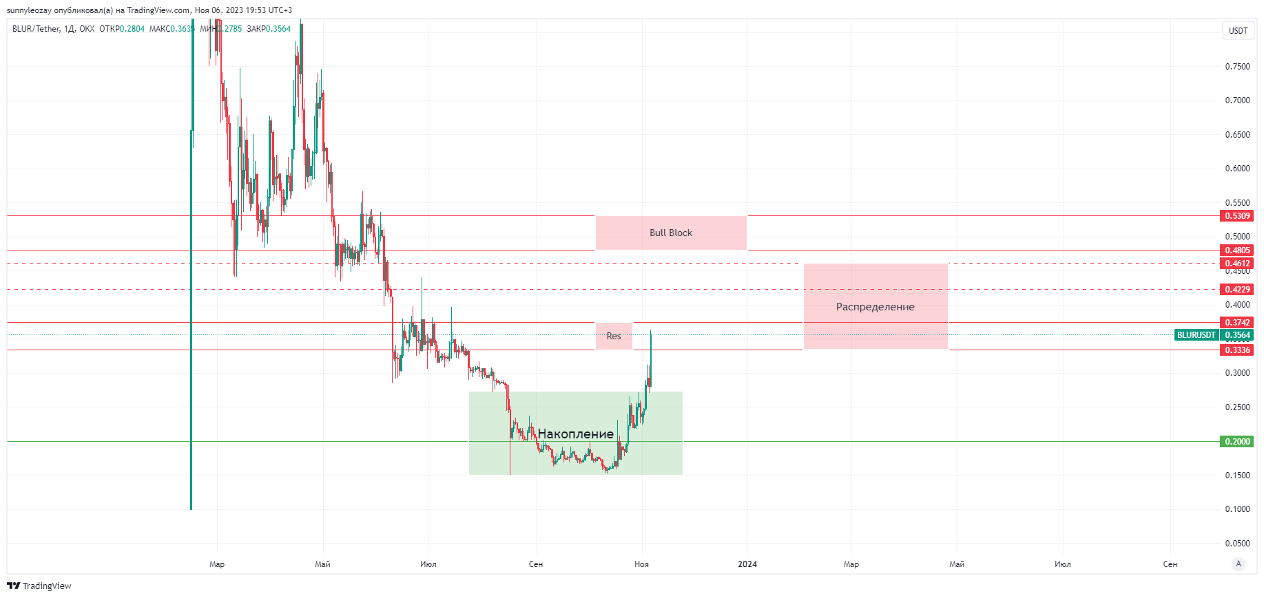 Считаю что Blur уже отыграл большую часть своего роста и покупать его с текущих уже опасно, а для тех кто держит монету на споте, ждет разлоки или дроп - чтобы продать, стоит уже начинать задумываться о фиксации, все что выше зоны 0.33 по моему мнению зона распределения, где крупный игрок будет потихоньку разгружаться об хомяков на эйфории. Зоны фиксации 0.37, 042, 0.46, 0.48.