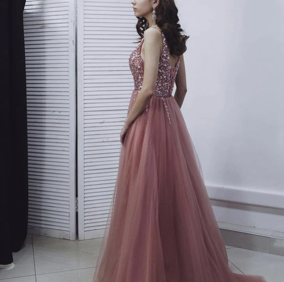 "Blush Pink Evening Dress A-Line V-Neck Tank Side Slit Backless Sequined Beads Tulle Floor Length Sparkle Party Prom Gown 2021" * Buy Now Just For 101$