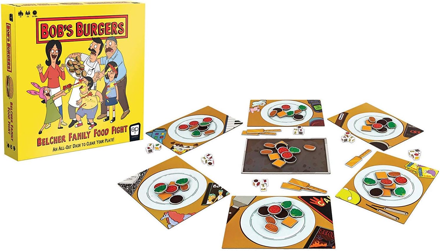 Bob's Burgers Belcher Family Food Fight is a game in which each player must get rid of all the food on their plate at the expense of the players to their left and right . Players simultaneously roll three dice and rapidly move the "food" according to the direction, quantity, and color indicated on the dice .