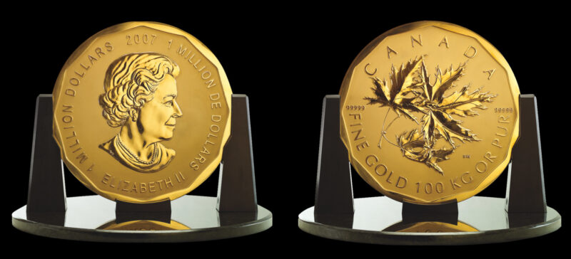 מה שכבר לא תוכלו לראות שם זה את מטבע ה-“ביג מייפל ליף” (Big Maple Leaf). מדובר במטבע ״קצת׳ מיוחד: קוטרו למעלה מחצי מטר, עוביו 2.8 ס״מ והוא שוקל 100 קילו. אה, שכחתי לספר: 100 קילו של זהב טהור, 99.999% ולכן ערכו הנקוב הוא מליון דולר קנדי (2.35 מליון שקל) וערכו בשוק הרבה הרבה יותר גבוה. המטבע הונפק ב-2007 על ידי המטבעה המלכותית של קנדה ויוצרו בסך הכל שישה עותקים, אחד מהם בכספת המרכזית של הבנק של קנדה. ואחד אחר נרכש ע״י איל הון אוקראיני-גרמני-יהודי בשם בוריס פוקסמן (Boris Fuksman).