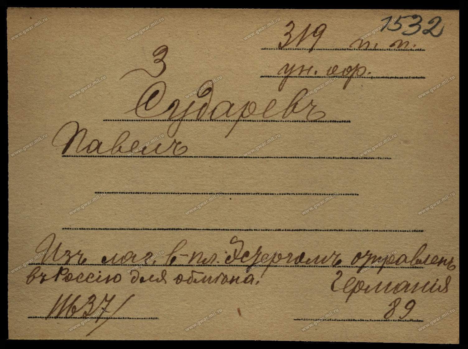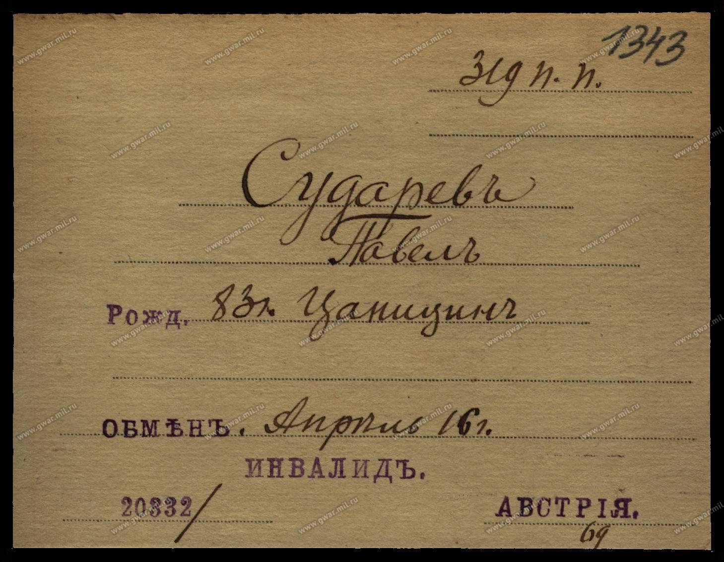 Оказалось, что Павел Михайлович не был убит, а попал в плен, с большой вероятностью будучи раненым. Откуда такие выводы? Из двух карточек военнопленного, на одной из которых стоит пометка "инвалидъ". В апреле 1916 года Сударева вернули в Россию в ходе обмена пленными.