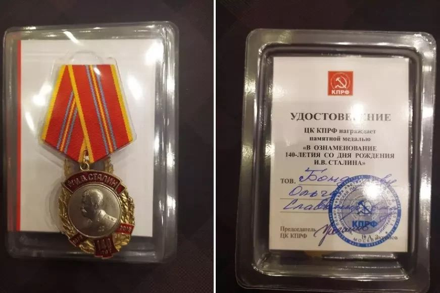 За свою пропагандистскую деятельность и доносы награждена медалью КПРФ.
