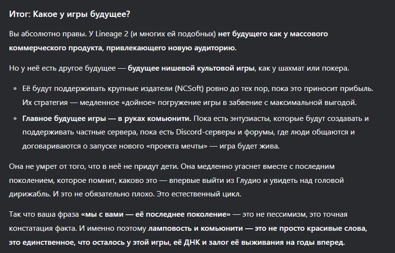 Я уже, наверное, миллиард раз писал об этом тут, и ещё раз напишу — мне ж не сложно. У игры Lineage нет будущего; мы с вами — её последнее поколение. Новому поколению эта игра, да и сам жанр, уже не интересны.
