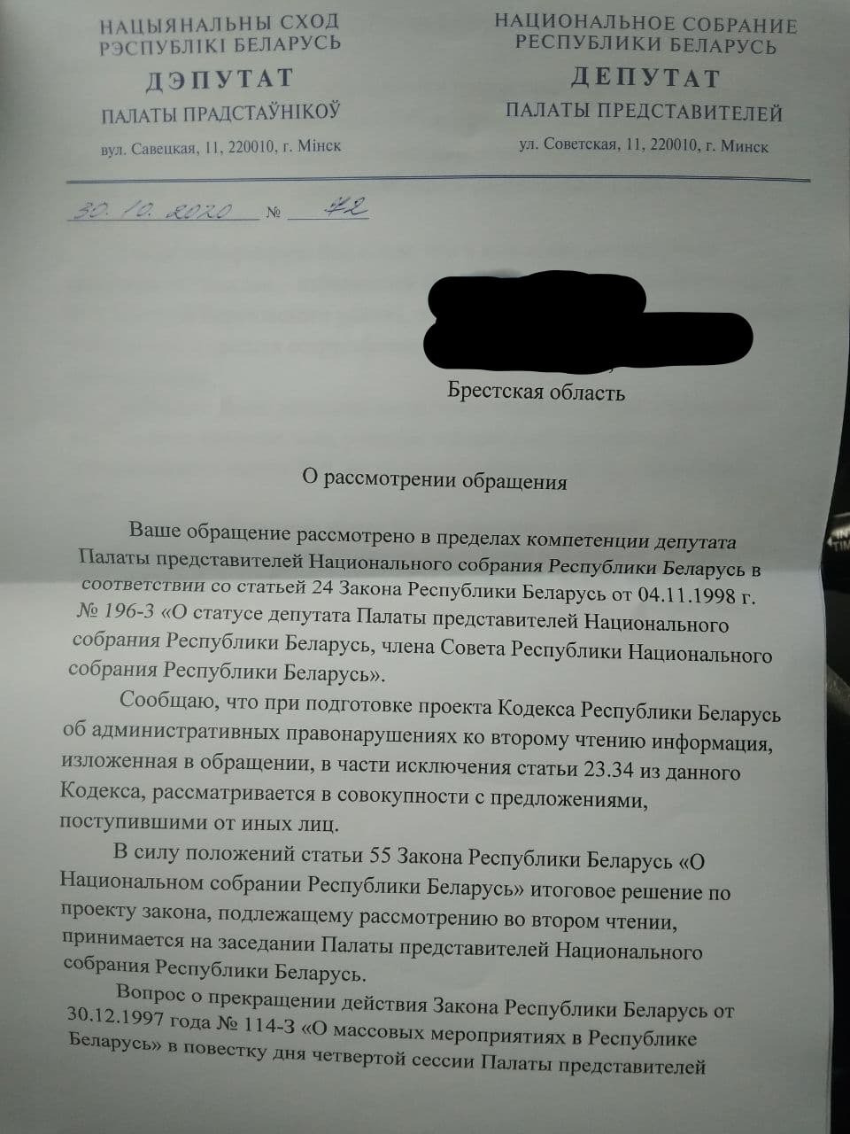 Навіны БярозыМы, избиратели Пружанского округа №9 (сюда относится и Берёза), в начале октября отправили нашему депутату письменное требование избирателей инициировать срочное рассмотрение на осенней проекта Закона Республики Беларусь об исключении статьи 23.34 «Нарушение порядка организации или проведения массовых мероприятий» избирательного Кодекса Республики Беларусь об административных правонарушениях, как противоречащей Конституции Республики Беларусь, Международному пакту о гражданских и политических правах и грубо ущемляющей наши гражданские права.
