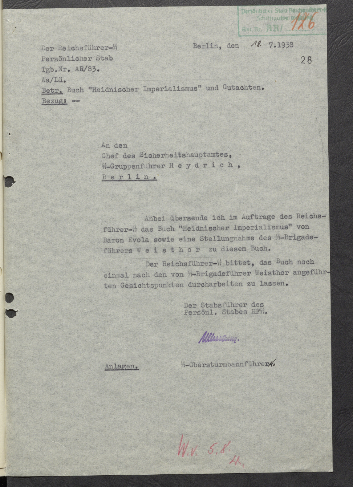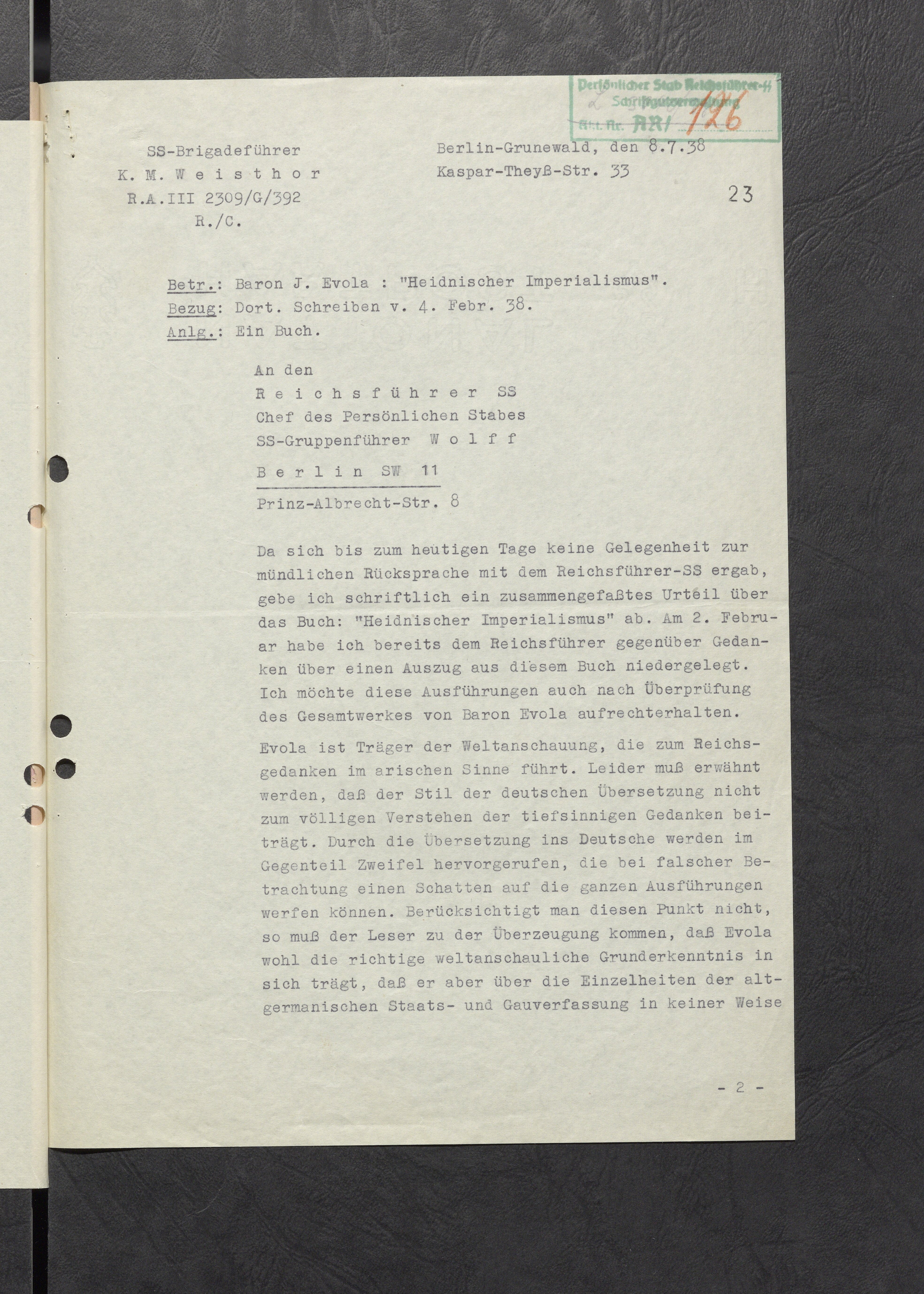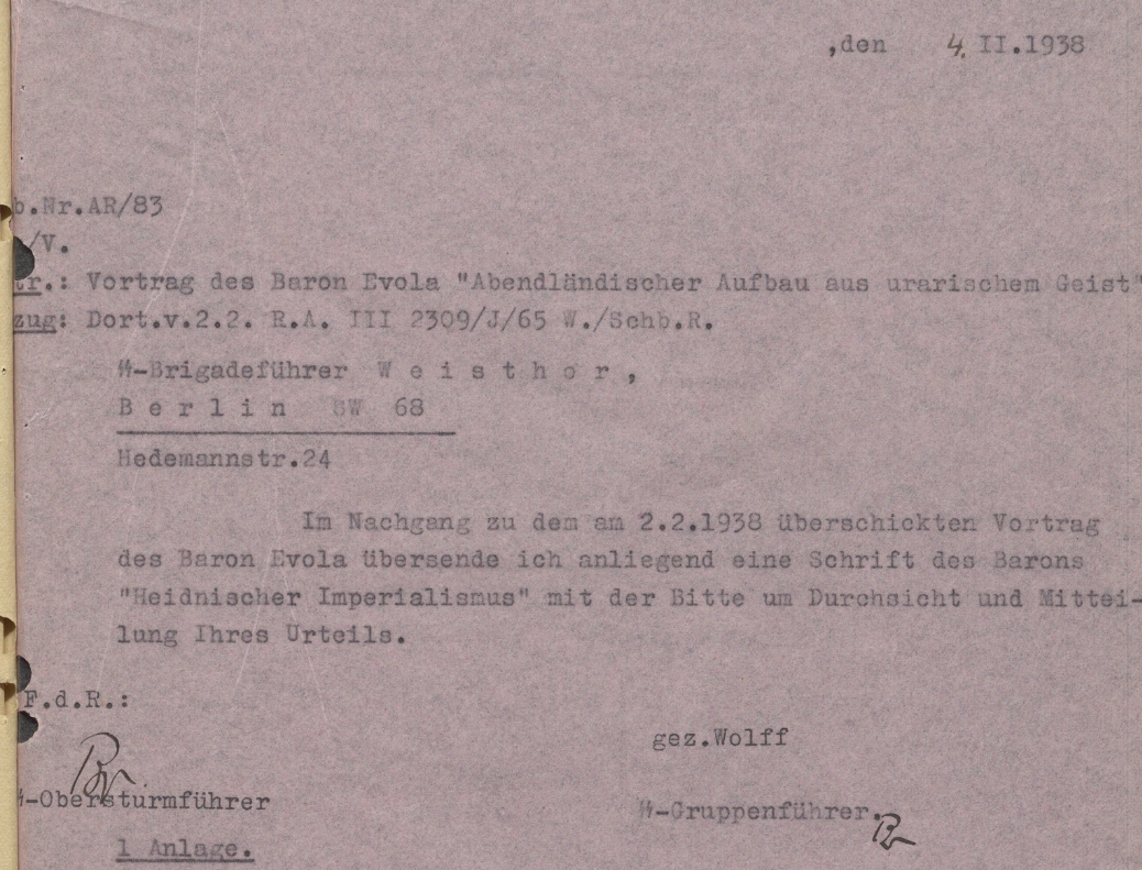 В приложении, по поручению Рейхсфюрера СС, пересылаю книгу "Языческий империализм" барона Эволы, а также позицию бригадефюрера Вайстора по этой книге. Рейхсфюрер СС просит переработать книгу ещё раз с учётом высказанных бригадефюрером СС Вайстором аспектов.