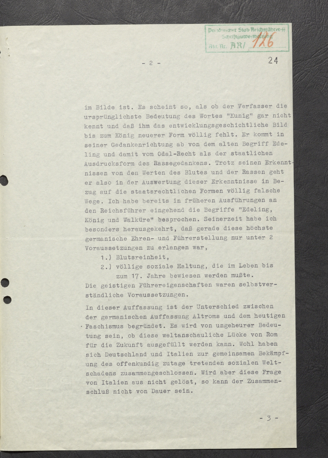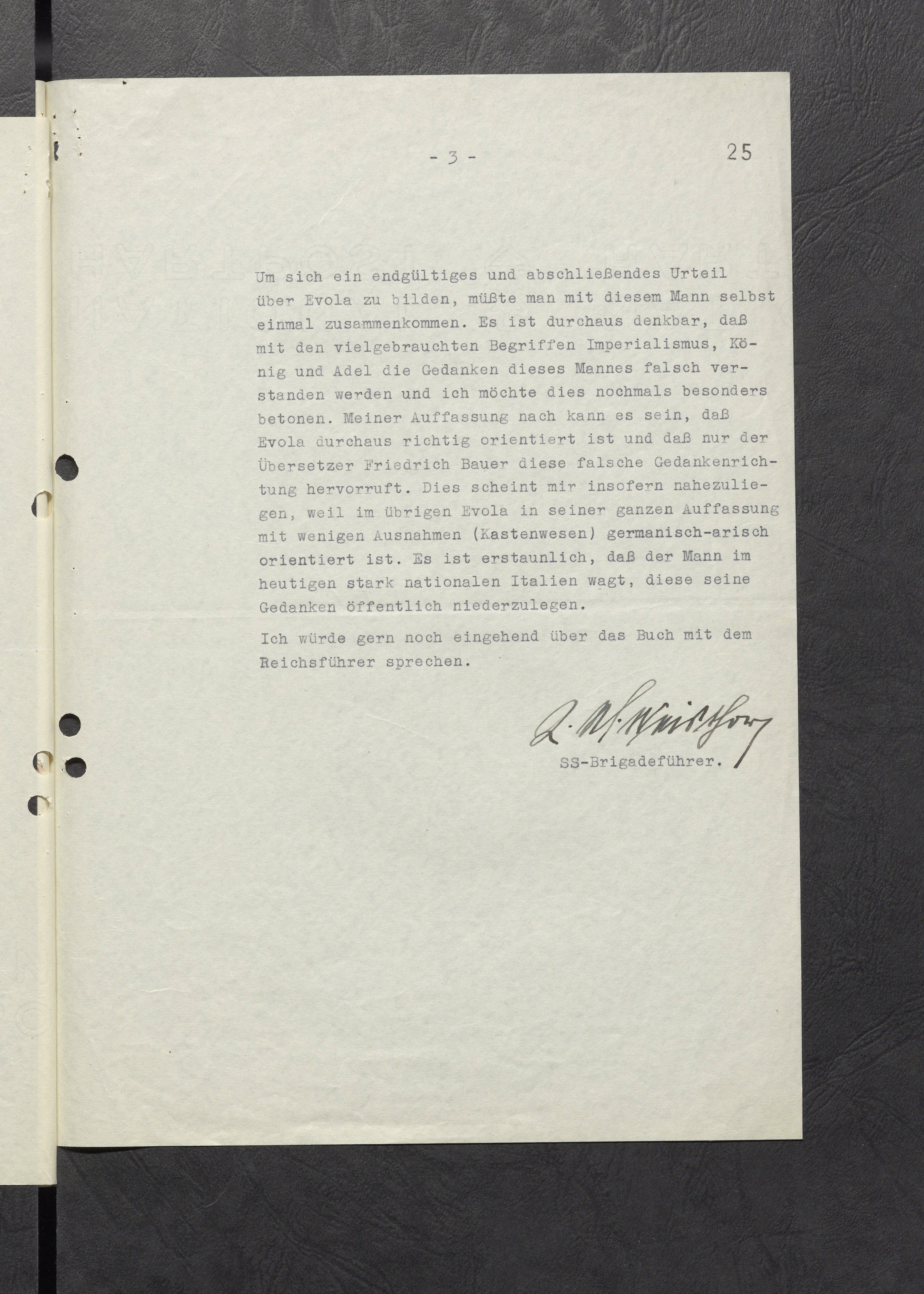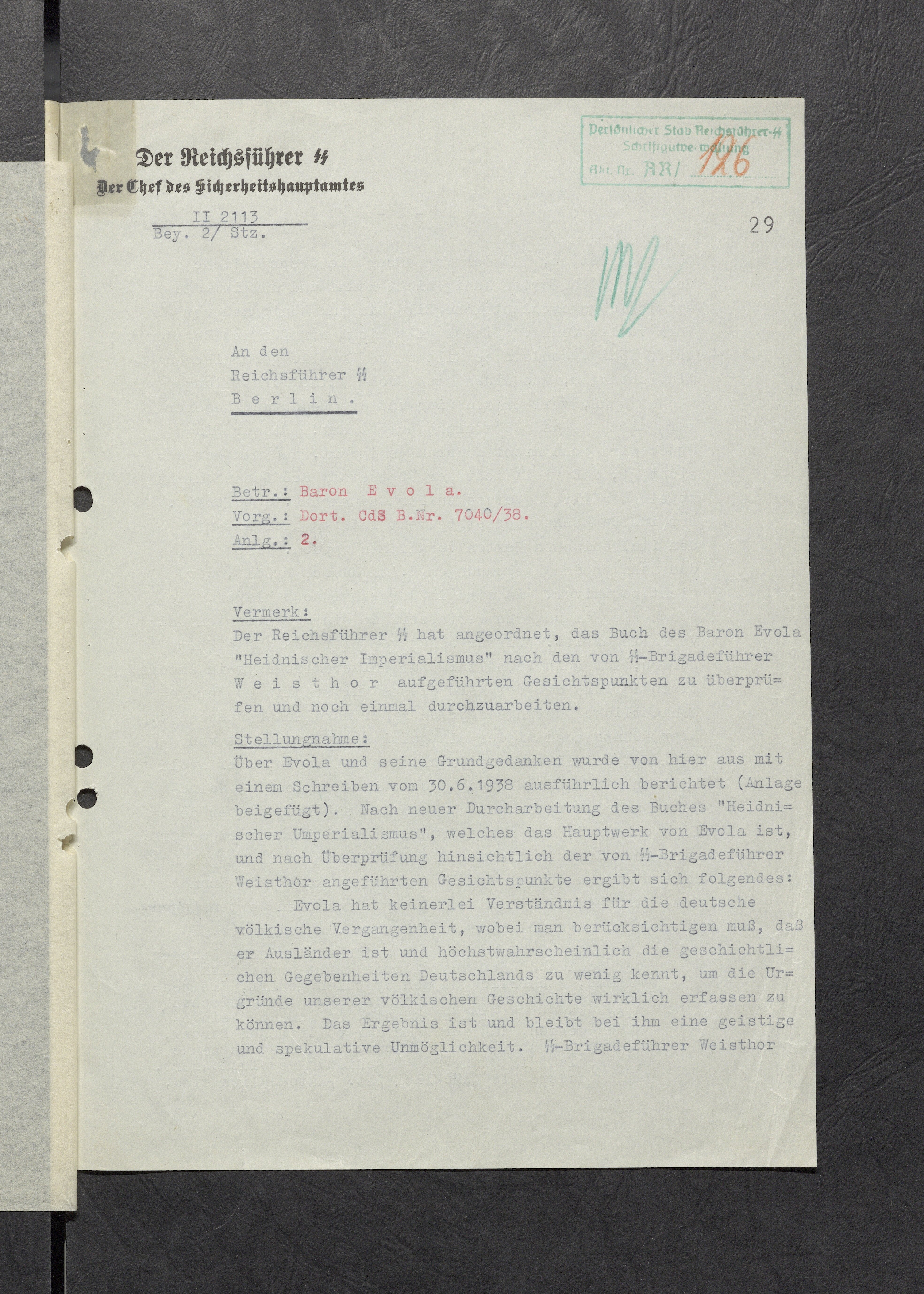 В приложении, по поручению Рейхсфюрера СС, пересылаю книгу "Языческий империализм" барона Эволы, а также позицию бригадефюрера Вайстора по этой книге. Рейхсфюрер СС просит переработать книгу ещё раз с учётом высказанных бригадефюрером СС Вайстором аспектов.