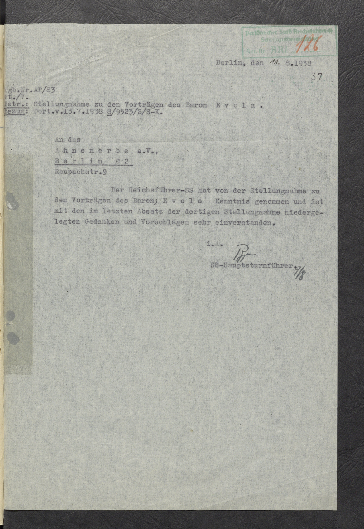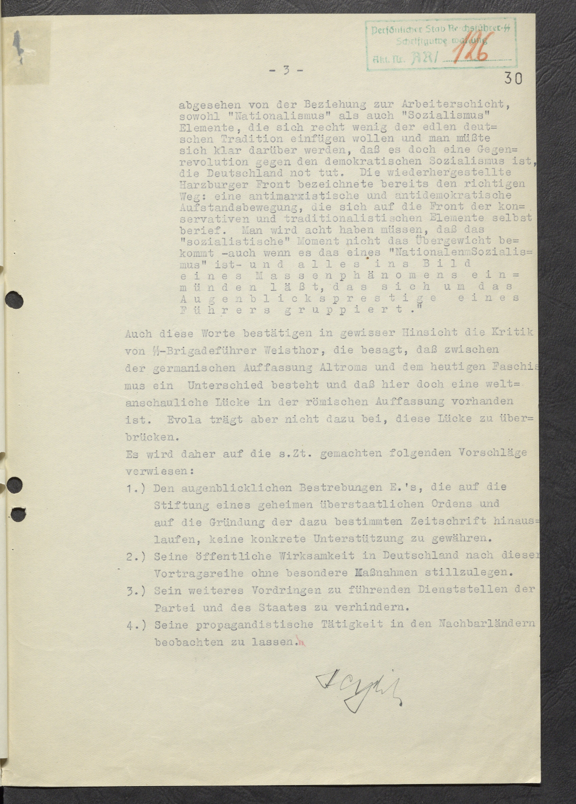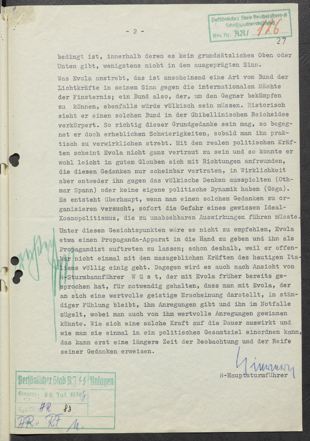 Рейхсфюрер-СС ознакомился со справкой о выступлениях барона Эволы и полностью согласен с изложенными в последнем абзаце данного мнения мыслями и предложениями.