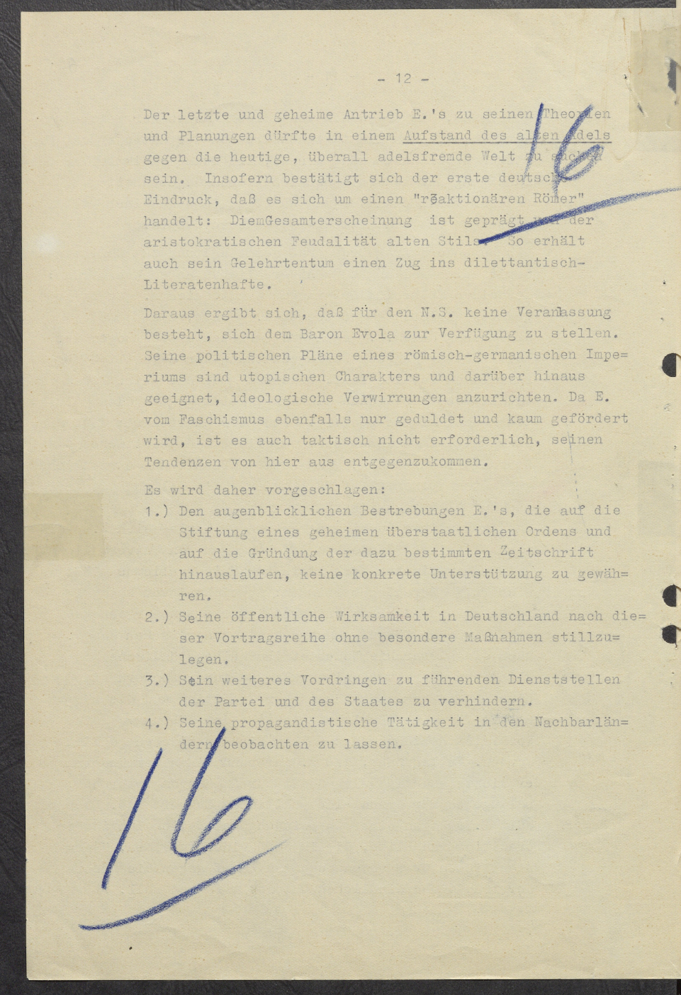 1.) Не предоставлять конкретной поддержки текущим усилиям Эволы, направленным на создание секретного межгосударственного ордена и основание соответствующего журнала.