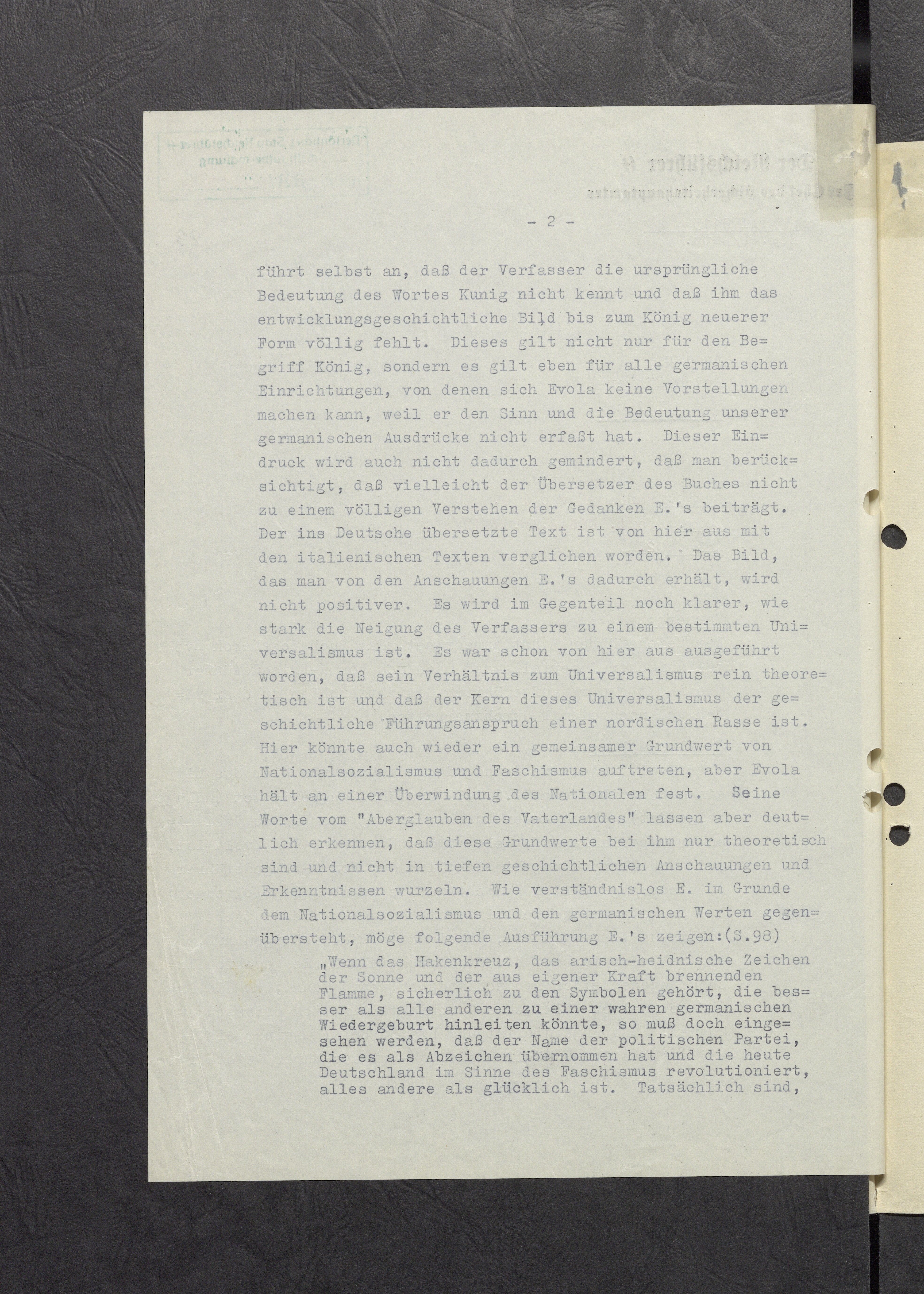 Эвола не имеет никакого понимания немецкого народного прошлого, что следует учитывать, учитывая его иностранное происхождение и, вероятно, недостаточное знание исторических фактов Германии для полного понимания первопричин нашей народной истории. Результатом является его интеллектуальная и спекулятивная невозможность. Сам бригадефюрер СС Вайстор отмечает, что автор не знает первоначального значения слова "Kunig" и что ему совсем не хватает эволюционной картины до понятия "король" в современной форме. Это относится не только к понятию "король", но и ко всем германским установлениям, которые Эвола не в состоянии представить, потому что он не понимает смысл и значение наших германских выражений. Это впечатление не ослабевает даже если учесть, что, возможно, переводчик книги не способствует полному пониманию мыслей Эволы. Текст на немецком был сравнен с итальянскими текстами. Полученное таким образом представление об взглядах Эволы не становится более положительным. Напротив, становится еще более ясным, насколько сильно склоняется автор к определенному универсализму. Отсюда было уже сказано, что его отношение к универсализму чисто теоретическое и что основой этого универсализма является исторический претензионный статус северной расы. Здесь могут снова возникнуть общие основные ценности национал-социализма и фашизма, но Эвола придерживается преодоления национального. Однако его слова о "суеверии отечества" ясно показывают, что эти основные ценности для него только теоретические и не коренятся в глубоких исторических взглядах и понимании. Как непонимающий основы национал-социализма и германских ценностей, Эвола заявляет следующее: (с. 98) Если символом, который лучше всех других может направить к истинному германскому возрождению, является свастика, арийский языческий символ солнца и пламени, горящего от собственной силы, то необходимо признать, что имя политической партии, которая приняла его в качестве знака и которая сегодня революционизирует Германию в духе фашизма, все, кроме удачного. Фактически, помимо отношения к рабочему классу, как "национализм", так и "социализм" - элементы, которые довольно слабо вписываются в благородную немецкую традицию, и нужно понимать, что это контрреволюция против демократического социализма, которая нужна Германии. Восстановленный Харцбургский фронт уже указывал на правильный путь: антимарксистское и антидемократическое восстание, опирающееся на фронт консервативных и традиционалистических элементов. Нужно будет обратить внимание, чтобы "социалистический" момент не получил превосходства, даже если это "национальный социализм", и не превратил всё в массовое явление, сгруппированное вокруг престижа лидера на момент.