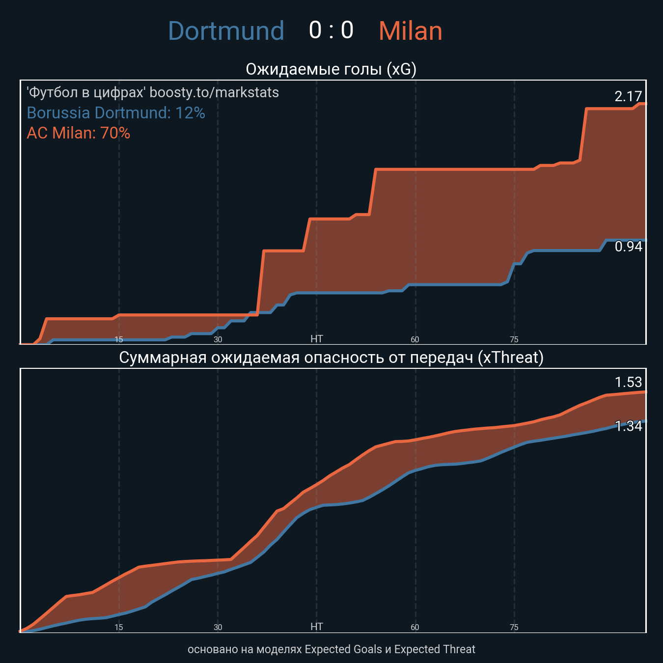 Ожидаемые голы (NPxG): 0.94 - 2.17