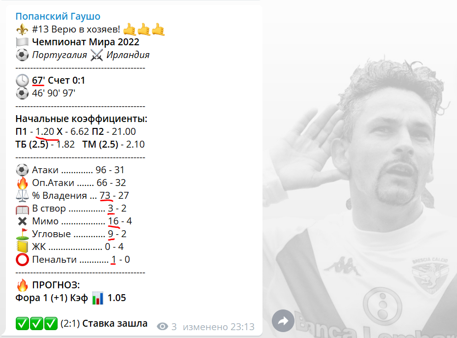 Международный перерыв для меня - это отдых от футбола, я слежу одним глазом лишь. Тут Гаушо меня уведомляет о том, что ирландцы обыгрывают в гостях португальцев. По статистике, сборная Ирландии отскакивает и чудом еще не пропустила. Сразу захожу на майскор смотреть состав, кто там у португальцев играет, что они не могут им дома забить. Вижу, что состав боевой и все ключевые в составе, даже CR7, который уже умудрился не забить пенку. Понимаю, что гостям тупо везет пока и КриРо достаточно мотивированный (мировой рекорд + незабитая пенка), но я же не попан, чтобы брать Ф1(+1) за 1.05.