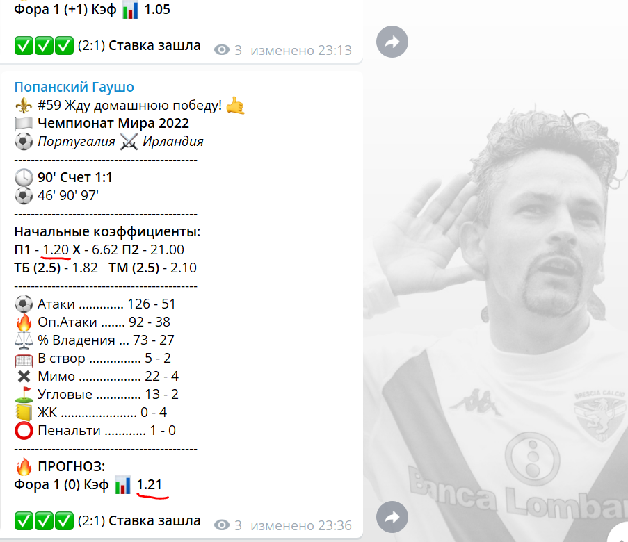 Я начинаю прикидывать варианты в голове и выбирать правильную ставку. Взять 1Х или гол португальцев? Осталось играть почти пол часа. За полчаса еще может многое случится, вдруг португальцы рано пойдут ва-банк и нарвутся на контр-атаку и пропустят еще? И на минуте 77-й может быть счет уже 0:2. Ирландцы тогда немного могут позволить себе спустить пар, так как счёт уже не скользкий, а португальцы будут все равно идти вперёд, не сдаваться же им на глазах у своих болельщиков?! Логически выходит, что гол португальцев менее рискованный, но чуть дешевле, чем 1х (1.55 давали в тот момент на гол португальцев). В это же время Фантомас мне присылает сочный прогноз по ЖК, и я принимаю решение поставить двойник на гол португальцев и на прогноз Фантика, в итоге у меня выходит приличный коэффициент с отличными шансами.