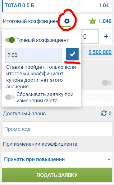 Вот мы взяли уже на один флэт ставку на ТБ 1 за 2.00. Снова ждём... ждём гол или кэф минимум 2.00 на ТБ 0.5, чтобы догнать первый флэт в случаи одного гола в матче. Чтобы не ждать у монитора, на наших говнобуках можно оставить заявку на коэффициент (тоже самое, что "лимит" на различных биржах, то есть, ставка произойдет автоматически когда коэффициент будет равен заданному).