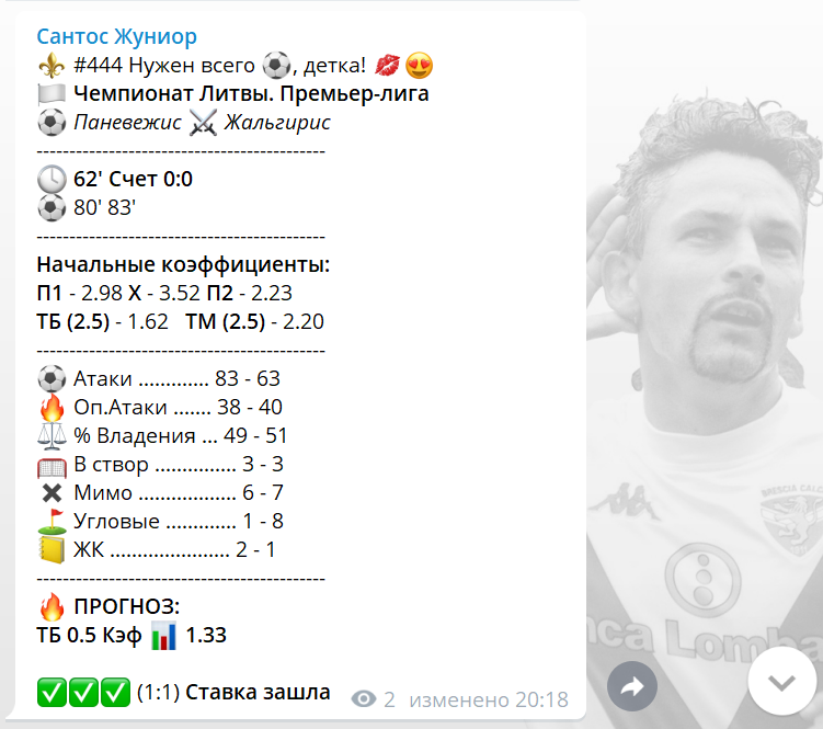 Шмоточник Сантос у нас был любителем ставок на "больше", особенно во 2-х таймах. Поэтому, вид ставки его сигналов довольно предсказуем.