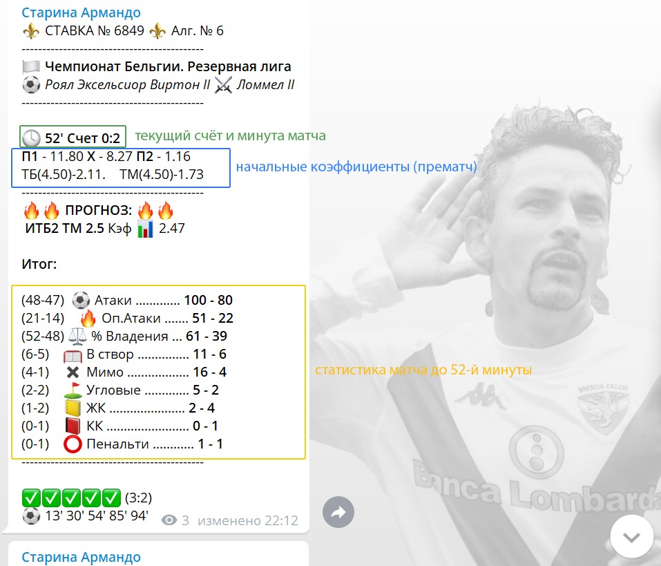 Вот вчера бот даёт сигнал по матчу https://t.me/syndicate_armando/6980.