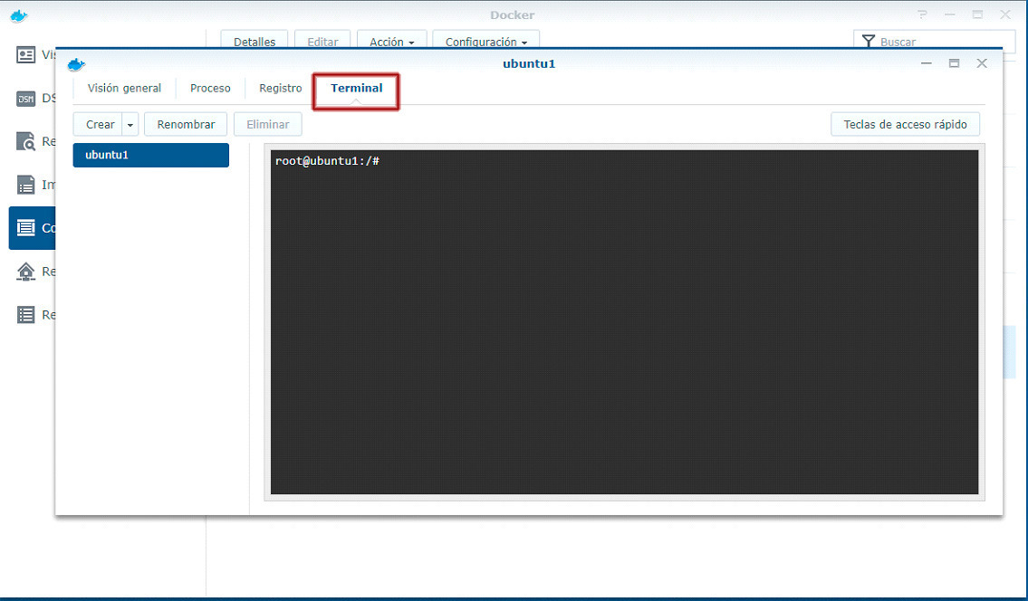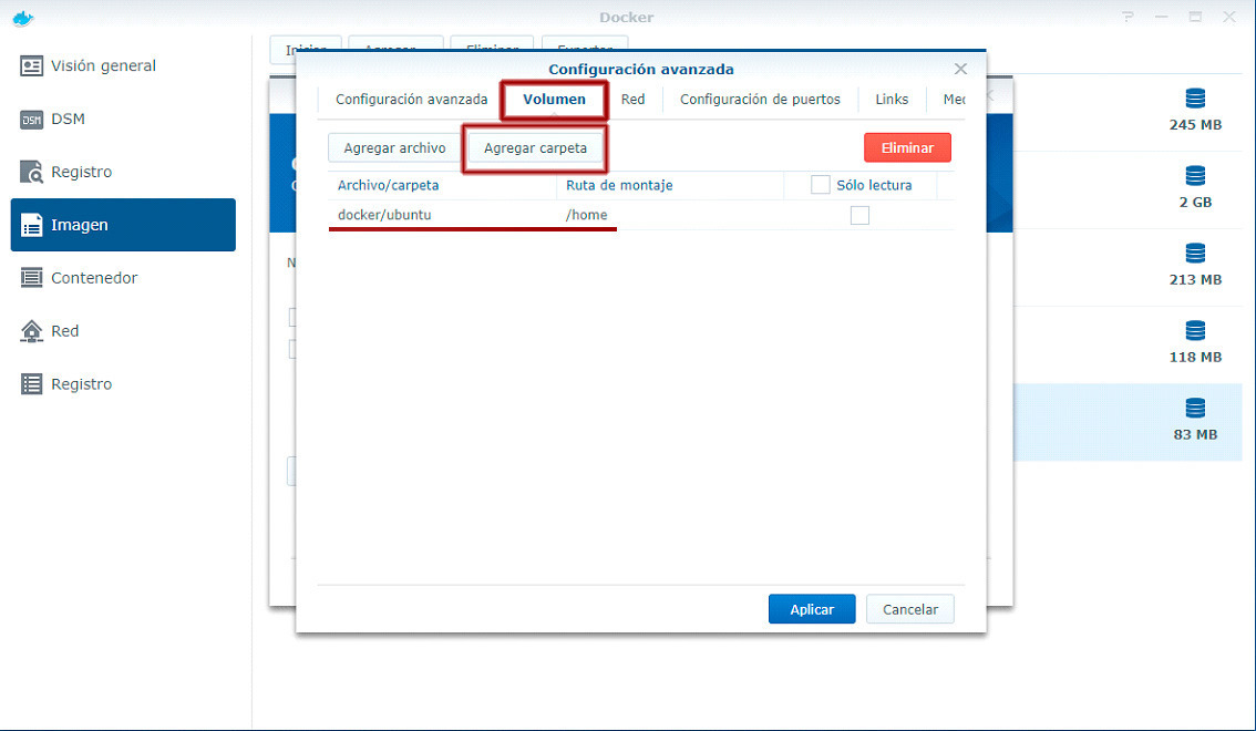 La carpeta docker/ubuntu es local del NAS y /home será del docker