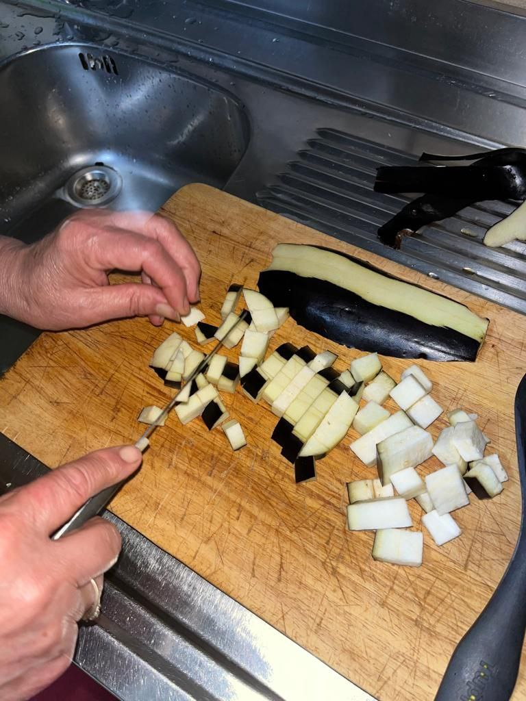 Lavate la melanzana, eliminate le estremità e sbucciatela parzialmente. Tagliatela in modo da ottenere dei cubetti di circa un centimetro.