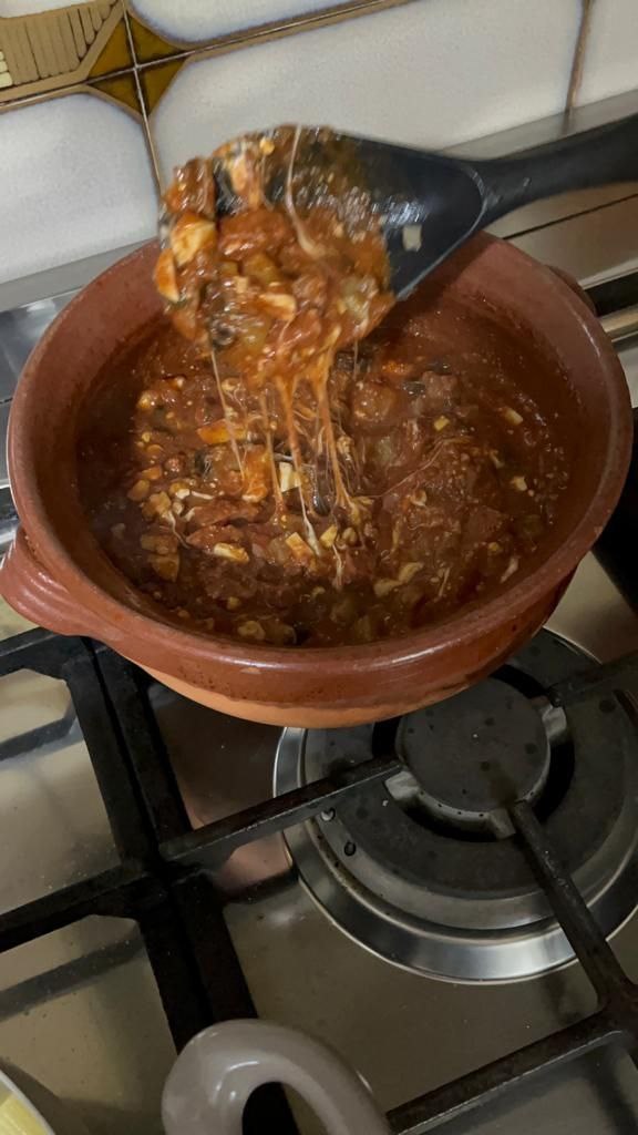 A cottura ultimata e a fuoco spento, dopo aver lasciato intiepidire il tutto, aggiungete la provola.