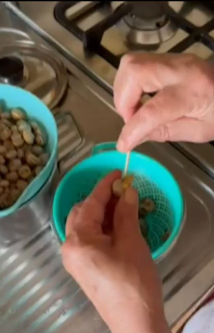 Lavare più volte le lumache, metterle in una pentola e farle cuocere fino a qualche minuto dopo che l'acqua inizia a bollire. Scolare e togliere il guscio.