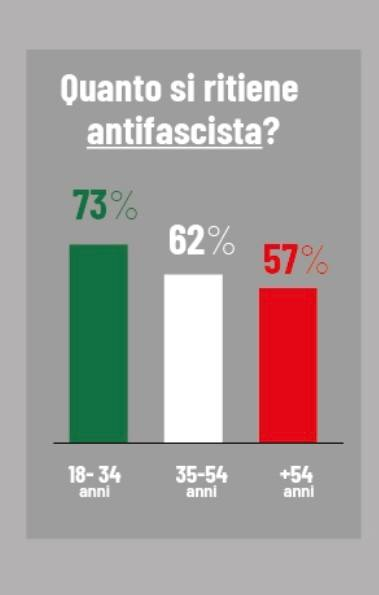 Stando a rilevazioni recenti da parte dell’istituto Piepoli, il 73% dei giovani si dichiara antifascista, e le percentuali scendono con l’avanzare dell’età. [3]