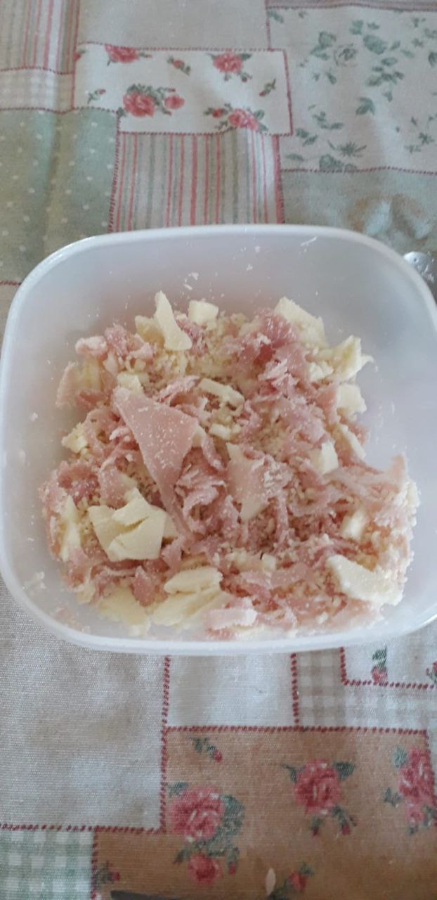 Preparare insieme in una ciotola, il prosciutto, la sottiletta ed il formaggio grattugiato.