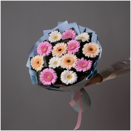 Les gerberas multicolores, ou « grandes marguerites », comme on les appelle aussi, sont élégantes et fraîches. La palette de couleurs du bouquet est pastel : une variété de couleurs allant du citron doux à la pêche. L'emballage rond en film bleu pâle rend le bouquet aéré et léger. Idéal comme cadeau pour une fille douce. Malheureusement, nous ne pouvons pas garantir une copie exacte du bouquet. Nos fleurs peuvent différer de celles présentées sur la photo, car elles nous proviennent de différentes parties du monde. À notre tour, nous garantissons le respect du style et de la composition de base du bouquet, vous pouvez en être sûr.
