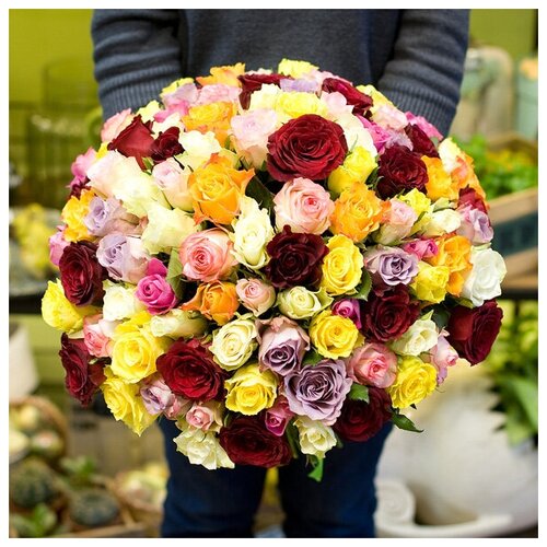 Bouquet de 101 roses du Kenya multicolores de 40 cm, nouées avec un ruban. Livré dans tout Moscou et Saint-Pétersbourg.