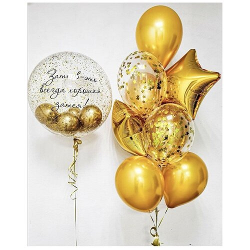 Le bouquet se compose de 9 ballons : Ballons chromés 35 cm : - 5 pièces ; Ballon étoile 46 cm : - 2 pièces ; Ballons confettis 35 cm : - 2 pièces ; Boule à bulles 61 cm avec l'inscription : - 1 pièce ; pcs ; Vous pouvez ajuster la palette de couleurs dans les commentaires de la commande, ou par téléphone avec notre responsable.