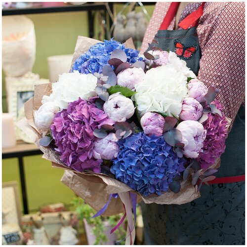 Un bouquet d'hortensias luxueux en rose, blanc et bleu, ainsi que de pivoines roses et d'eucalyptus dans un magnifique emballage.