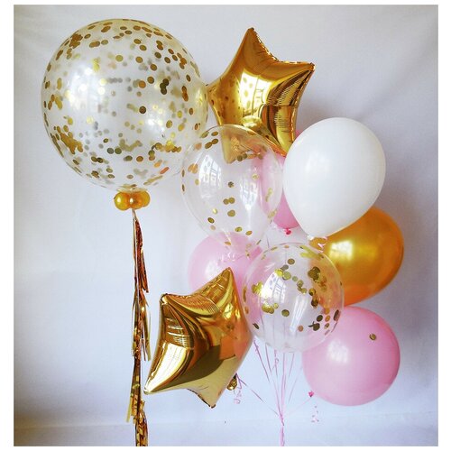Le bouquet se compose de 10 ballons : Ballons en latex 35 cm : - 5 pièces ; Ballons avec confettis : - 2 pièces ; Ballons étoiles 46 cm : - 2 pièces ; Ballons avec confettis 71 cm : - 1 pièce ;