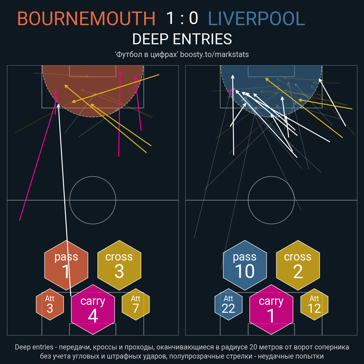 7 успешных передач из 20 попыток (1 ассист, 1 под удар, 2 с продвижением, 2 на трети соперника)