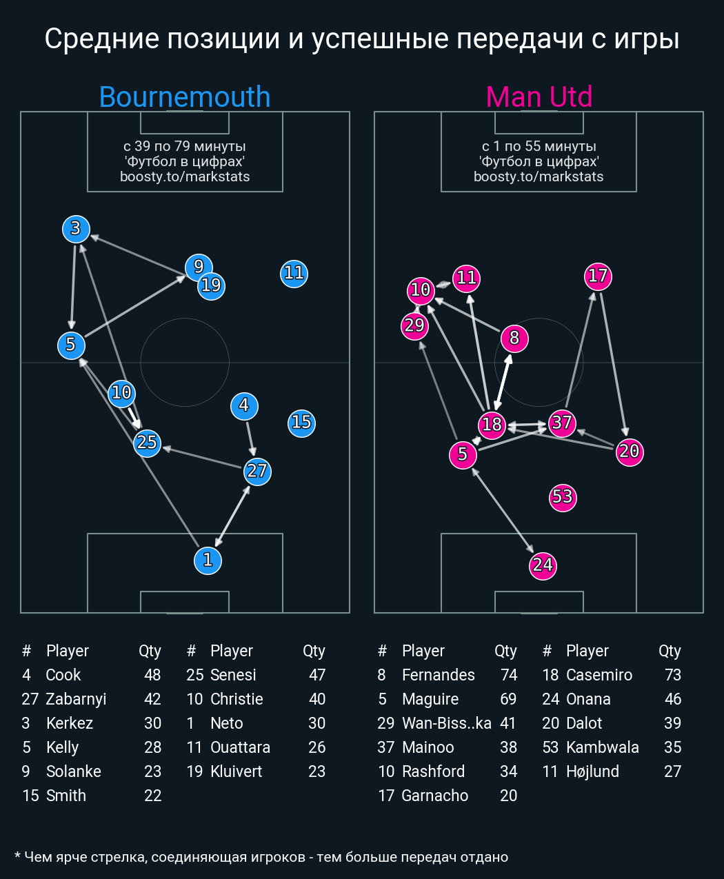 68 успешных передач из 82 попыток (10 с продвижением, 1 на трети соперника)