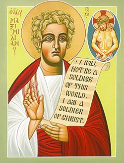 Такой подход представлен в церковном предании житием св. мученика Максимилиана Тебесского, пострадавшего в 18-летнем возрасте во время гонений на христиан императора Диоклетиана (295 г.). Он был казнен после отказа принять военную присягу в императорском войске.