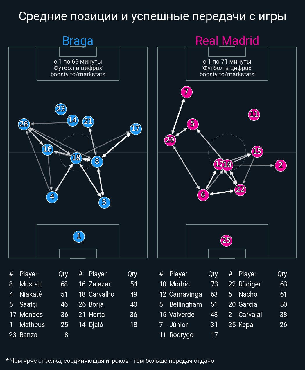 61 успешных передач из 65 попыток (7 с продвижением, 4 на трети соперника)