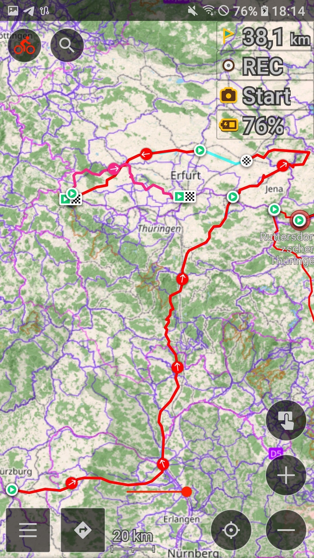 Das Wetter spielte hervorragend mit und Schauer blieben aus. Auch der Gegenwind aus Nordost hielt sich meist in Grenzen. Die Route mehr oder weniger frei der Nase nach zu legen, entwickelte sich allerdings mehr in eine kleine Gravel-Tour, als es bei Aschach etwas undurchsichtig wurde, wie man am besten Richtung Erfurt kommt. Am Ende war doch eine Strecke von etwas über 90 km zusammen gekommen :)