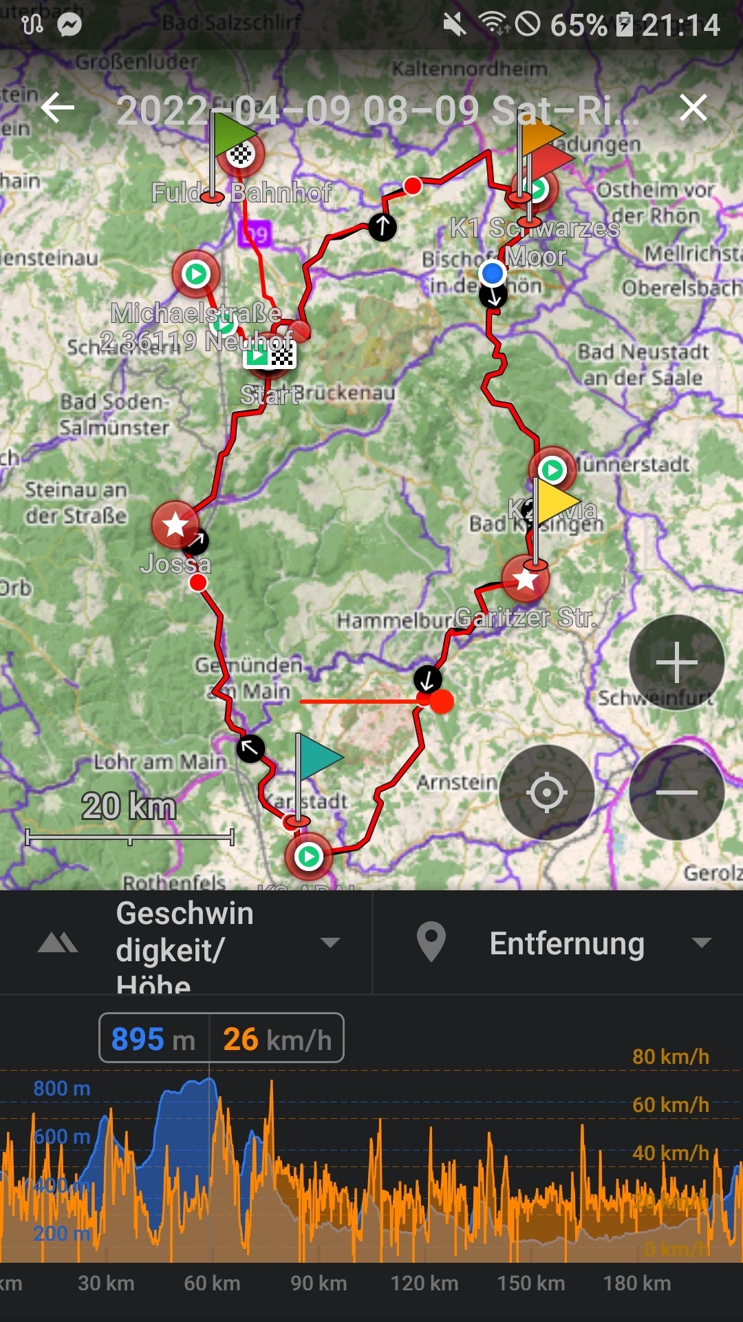 Mal wieder Gegenwind... Aber erst später nennenswert, und nicht ganz so stark wie befürchtet. Auf der diesmal gewählten kurzen Straßen-Route lief es deutlich gleichmäßiger, als normalerweise auf dem Radweg über Ronneburg. Mit etwas Rückenwind sollte die Strecke in Zukunft in unter 3h kein Problem sein ^^