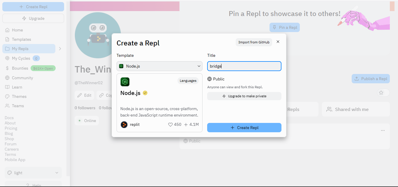 2) Create a new Node.js repls and set a Title