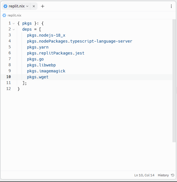 3) Open replit.nix file for add packages to the project