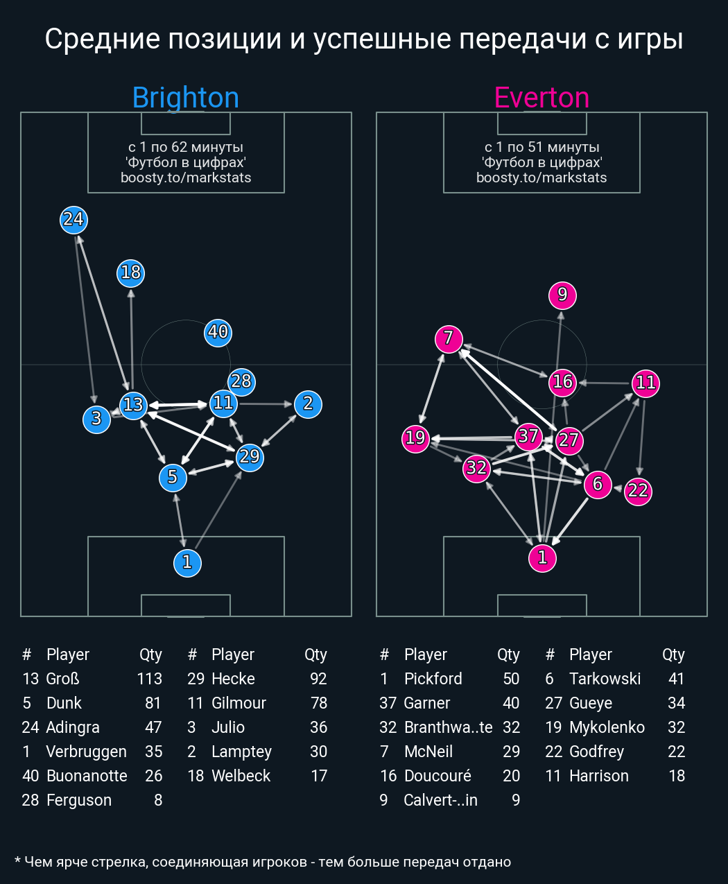 85 успешных передач из 92 попыток (5 с продвижением, 3 на трети соперника)