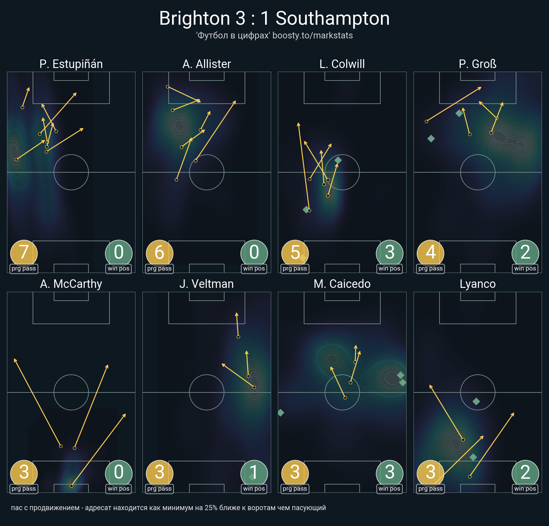 23 успешных передач из 25 попыток (1 ассист, 4 под удар, 3 с продвижением, 14 на трети соперника)